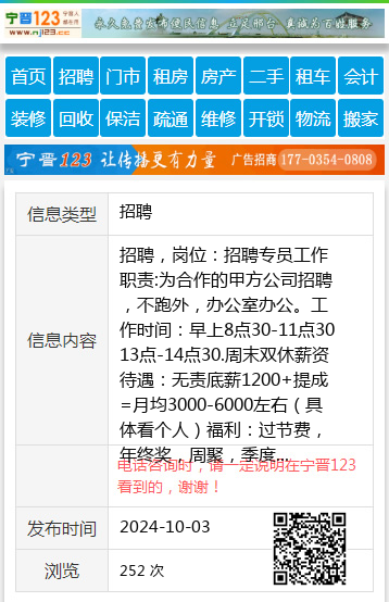 招聘,岗位:招聘专员工作职责:为合作的甲方公司招聘,不跑外,办公室办公。工作时间:早上8点30-11点3013点-14点30.周末双休薪资待遇:无责底薪1200+提成=月均3000-6000左右(具体看个人)福利:过节费,年终奖,周聚,季度旅游。要求:1,年龄:20-38岁,2,熟练使用电脑,会简单的办公软件。3,说话流利,语言清晰。非诚勿扰。魏先生18945477804 |