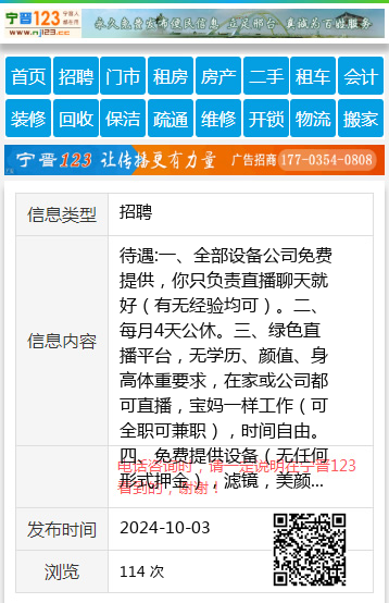 待遇:一、全部设备公司免费提供,你只负责直播聊天就好(有无经验均可)。二、每月4天公休。三、绿色直播平台,无学历、颜值、身高体重要求,在家或公司都可直播,宝妈一样工作(可全职可兼职),时间自由。四、免费提供设备(无任何形式押金),滤镜,美颜,声卡,让你焕然一新。一对一(免费培训)直播技巧、化妆、才艺。面试成功即可享受签约奖金,薪资5000-10000(无上限).不要让梦想只是梦想,让梦想从这里起航!欢迎致电。公司地址:建民小区3号楼。联系电话:15946427520(微信同步)杨经理15946427520 【电话咨询时,请一定说明在七台河信息网看到的,谢谢!】 |