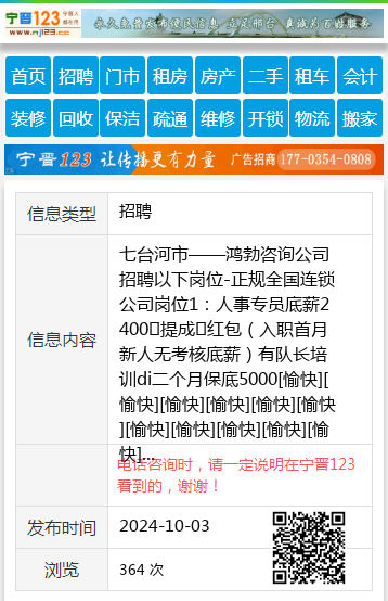 七台河市——鸿勃咨询公司招聘以下岗位-正规全国连锁公司岗位1:人事专员底薪2400➕提成➕红包(入职首月新人无考核底薪)有队长培训di二个月保底5000[愉快][愉快][愉快][愉快][愉快][愉快][愉快][愉快][愉快][愉快][愉快]岗位2:招聘客服保底3000➕提成回复群微信58boss使用招聘软件有强大的内心和沟通能力。[666][666][666][666][666][666][666][666][666][666][666]????????????????????????????????????????。上班时间:早9点上班4.5点下班中午休息1小时每月有带薪休假2天节假日有休息福利待遇:工作满12个月有300元保险补助联系电话☎️13846498401赵18504645576 【电话咨询时,请一定说明在七台河信息网看到的,谢谢!】 |