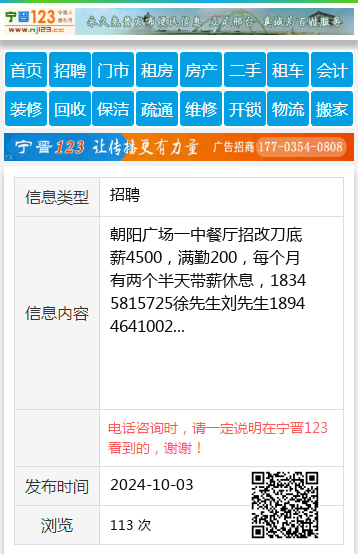 朝阳广场一中餐厅招改刀底薪4500,满勤200,每个月有两个半天带薪休息,18345815725徐先生刘先生18944641002 【电话咨询时,请一定说明在七台河信息网看到的,谢谢!】 |
