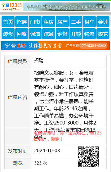 招聘文员客服,女,会电脑基本操作,会打字,性格好有耐心,细心,口齿清晰,领悟力强,对工作认真负责,七台河市常住居民,能长期工作。年龄25-45之间,工作简单易懂,办公环境干净。工资2500-3000,月休2天,工作地点:景丰家园徐13604576505 【电话咨询时,请一定说明在七台河信息网看到的,谢谢!】 |