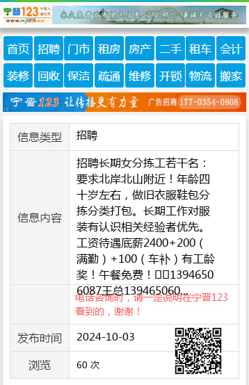 招聘长期女分拣工若干名:要求北岸北山附近!年龄四十岁左右,做旧衣服鞋包分拣分类打包。长期工作对服装有认识相关经验者优先。工资待遇底薪2400+200(满勤)+100(车补)有工龄奖!午餐免费!☎️13946506087王总13946506087