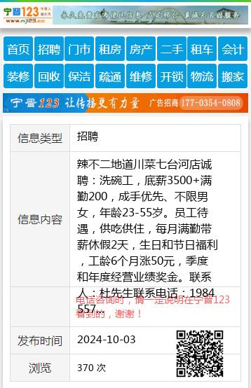 辣不二地道川菜七台河店诚聘:洗碗工,底薪3500+满勤200,成手优先、不限男女,年龄23-55岁。员工待遇,供吃供住,每月满勤带薪休假2天,生日和节日福利,工龄6个月涨50元,季度和年度经营业绩奖金。联系人:杜先生联系电话:19845570003、15846195888工作地址:七台河市桃山区文华路92号祝先生19845570003 【电话咨询时,请一定说明在七台河信息网看到的,谢谢!】 |