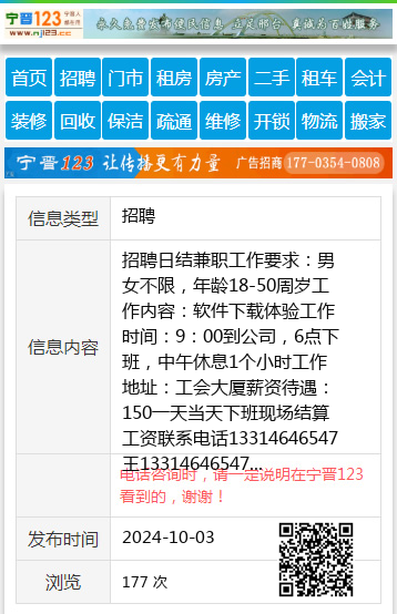 招聘日结兼职工作要求:男女不限,年龄18-50周岁工作内容:软件下载体验工作时间:9:00到公司,6点下班,中午休息1个小时工作地址:工会大厦薪资待遇:150一天当天下班现场结算工资联系电话13314646547王13314646547 【电话咨询时,请一定说明在七台河信息网看到的,谢谢!】 |