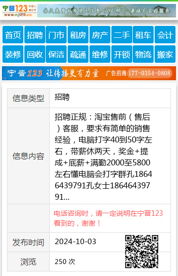 招聘正规:淘宝售前(售后)客服,要求有简单的销售经验,电脑打字40到50字左右,带薪休两天,奖金+提成+底薪+满勤2000至5800左右懂电脑会打字群孔18646439791孔女士18646439791 【电话咨询时,请一定说明在七台河信息网看到的,谢谢!】 |