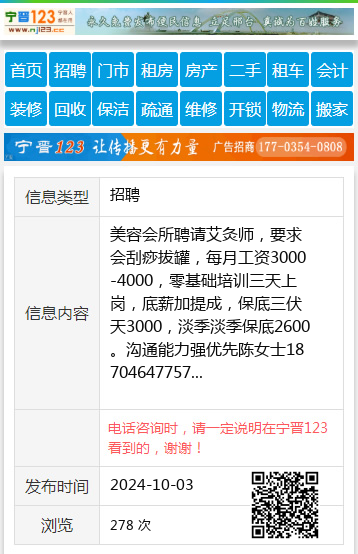 美容会所聘请艾灸师,要求会刮痧拔罐,每月工资3000-4000,零基础培训三天上岗,底薪加提成,保底三伏天3000,淡季淡季保底2600。沟通能力强优先陈女士18704647757 【电话咨询时,请一定说明在七台河信息网看到的,谢谢!】 |