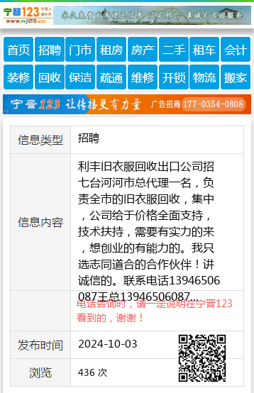 利丰旧衣服回收出口公司招七台河河市总代理一名,负责全市的旧衣服回收,集中,公司给于价格全面支持,技术扶持,需要有实力的来,想创业的有能力的。我只选志同道合的合作伙伴!讲诚信的。联系电话13946506087王总13946506087 【电话咨询时,请一定说明在七台河信息网看到的,谢谢!】 |