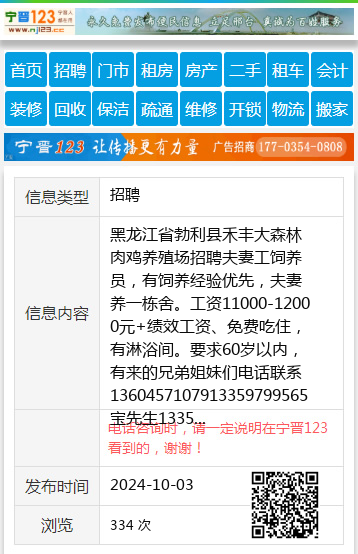 黑龙江省勃利县禾丰大森林肉鸡养殖场招聘夫妻工饲养员,有饲养经验优先,夫妻养一栋舍。工资11000-12000元+绩效工资、免费吃住,有淋浴间。要求60岁以内,有来的兄弟姐妹们电话联系1360457107913359799565宝先生13359799565 【电话咨询时,请一定说明在七台河信息网看到的,谢谢!】 |
