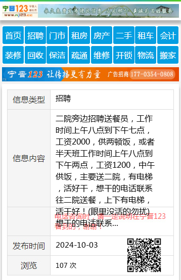 二院旁边招聘送餐员,工作时间上午八点到下午七点,工资2000,供两顿饭,或者半天班工作时间上午八点到下午两点,工资1200,中午供饭,主要送二院,有电梯,活好干,想干的电话联系往二院送餐,上下有电梯,活干好!(眼里没活的勿扰)想干的电话联系吧!(备注两个月起,短期勿扰)王18846466507 【电话咨询时,请一定说明在七台河信息网看到的,谢谢!】 |