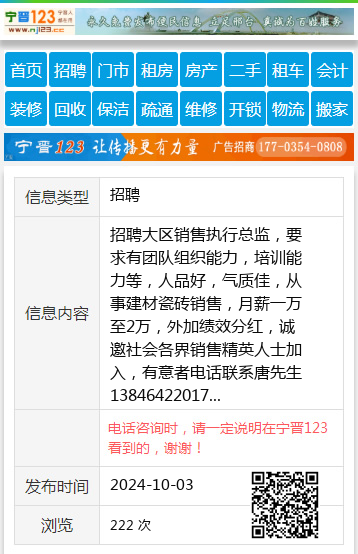 招聘大区销售执行总监,要求有团队组织能力,培训能力等,人品好,气质佳,从事建材瓷砖销售,月薪一万至2万,外加绩效分红,诚邀社会各界销售精英人士加入,有意者电话联系唐先生13846422017 【电话咨询时,请一定说明在七台河信息网看到的,谢谢!】 |