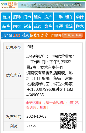 现有鸭货店:“招聘营业员”,工作时间:下午5点到凌晨2点,要求有责任心;工资面议有意者到店面谈。地址:山上狼嚎一条街,常来地摊烧烤对面,俏舌尖鸭颈王:13039799608刘女士18246496065 【电话咨询时,请一定说明在七台河信息网看到的,谢谢!】 |
