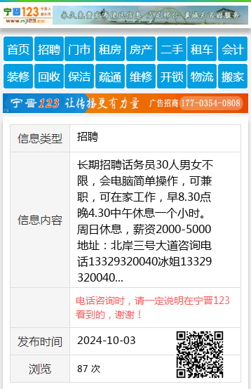 长期招聘话务员30人男女不限,会电脑简单操作,可兼职,可在家工作,早8.30点晚4.30中午休息一个小时。周日休息,薪资2000-5000地址:北岸三号大道咨询电话13329320040冰姐13329320040 【电话咨询时,请一定说明在七台河信息网看到的,谢谢!】 |