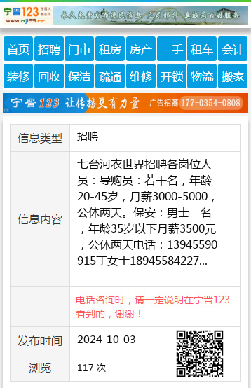 七台河衣世界招聘各岗位人员:导购员:若干名,年龄20-45岁,月薪3000-5000,公休两天。保安:男士一名,年龄35岁以下月薪3500元,公休两天电话:13945590915丁女士18945584227 【电话咨询时,请一定说明在七台河信息网看到的,谢谢!】 |