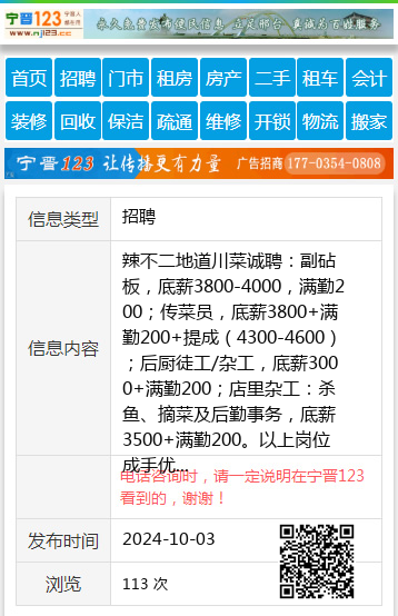 辣不二地道川菜诚聘:副砧板,底薪3800-4000,满勤200;传菜员,底薪3800+满勤200+提成(4300-4600);后厨徒工/杂工,底薪3000+满勤200;店里杂工:杀鱼、摘菜及后勤事务,底薪3500+满勤200。以上岗位成手优先,年龄23-55岁。员工待遇,供吃供住,每月满勤带薪休假2天,生日和节日福利,工龄6个月涨50元,季度和年度经营业绩奖金。工作地址:七台河市桃山区文华路92号联系人:祝先生联系电话:19845570003、15846195888祝先生19845570003 【电话咨询时,请一定说明在七台河信息网看到的,谢谢!】 |