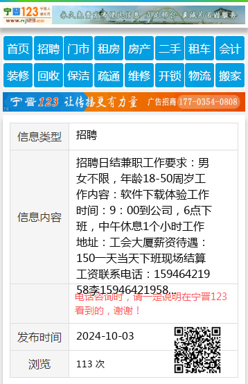 招聘日结兼职工作要求:男女不限,年龄18-50周岁工作内容:软件下载体验工作时间:9:00到公司,6点下班,中午休息1个小时工作地址:工会大厦薪资待遇:150一天当天下班现场结算工资联系电话:15946421958李15946421958 【电话咨询时,请一定说明在七台河信息网看到的,谢谢!】 |