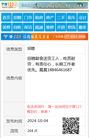 招聘副食送货工人,吃苦耐劳,有责任心,长期工作者优先。晨晨18846461687