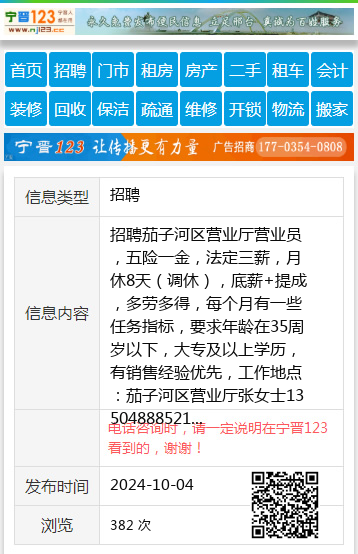 招聘茄子河区营业厅营业员,五险一金,法定三薪,月休8天(调休),底薪+提成,多劳多得,每个月有一些任务指标,要求年龄在35周岁以下,大专及以上学历,有销售经验优先,工作地点:茄子河区营业厅张女士13504888521 【电话咨询时,请一定说明在七台河信息网看到的,谢谢!】 |