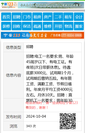 招聘:电工一名要求:男、年龄45周岁以下、有电工证。有夜班(次日带薪休息)。待遇:底薪3000元、试用期1个月,试用期后缴纳五险。有年限工资、满勤工资、节假日福利。年度月平均工资4000元左右。月休10天。招聘:直燃机工一名要求:男年龄30-45岁待遇:底薪2500元试用期1个月,试用期后缴纳五险。有年限工资、满勤工资、节假日福利联系电话:13846487139招聘:消防员一名要求:男年龄18-40岁能上高待遇:底薪2500元试用期1个月,试用期后缴纳五险。有年限工资、满勤工资、节假日福利联系电话:17766554233招聘:保安员一名要求:男年龄18-40岁待遇:底薪2100元试用期1个月,试用期后缴纳五险。有年限工资、满勤工资、节假日福利联系电话:15046852914工作地址:桃山区东北亚商场招聘单位:七台河市东北亚商业有限公司黄经理18646437111 【电话咨询时,请一定说明在七台河信息网看到的,谢谢!】 |