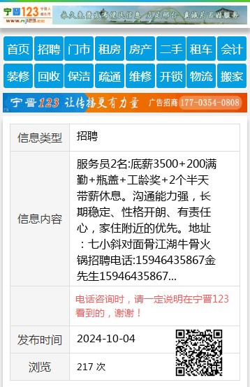 服务员2名:底薪3500+200满勤+瓶盖+工龄奖+2个半天带薪休息。沟通能力强,长期稳定、性格开朗、有责任心,家住附近的优先。地址:七小斜对面骨江湖牛骨火锅招聘电话:15946435867金先生15946435867