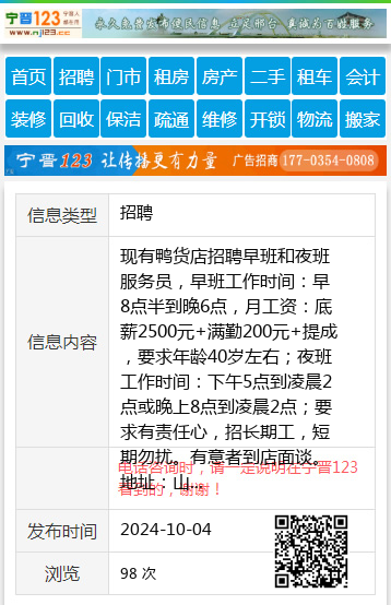 现有鸭货店招聘早班和夜班服务员,早班工作时间:早8点半到晚6点,月工资:底薪2500元+满勤200元+提成,要求年龄40岁左右;夜班工作时间:下午5点到凌晨2点或晚上8点到凌晨2点;要求有责任心,招长期工,短期勿扰。有意者到店面谈。地址:山上狼嚎一条街,常来地摊烧烤对面,俏舌尖鸭颈王电话:13039799608张先生13039799608 【电话咨询时,请一定说明在七台河信息网看到的,谢谢!】 |