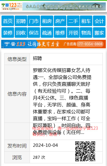 罗娜文化传媒招募女艺人待遇:一、全部设备公司免费提供,你只负责直播聊天就好(有无经验均可)。二、每月4天公休。三、绿色直播平台,无学历、颜值、身高体重要求,在家或公司都可直播,宝妈一样工作(可全职可兼职),时间自由。四、免费提供设备(无任何形式押金),滤镜,美颜,声卡,让你焕然一新。一对一(免费培训)直播技巧、化妆、才艺。面试成功即可享受签约奖金,薪资5000-10000(无上限).不要让梦想只是梦想,让梦想从这里起航!欢迎致电。公司地址:建民小区3号楼。联系电话:15946427520(微信同步)杨经理15946427520 |