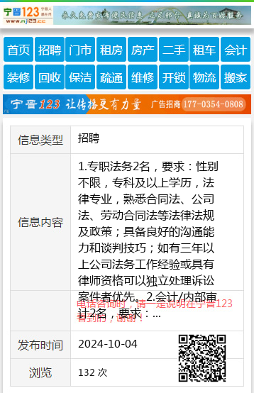 1.专职法务2名,要求:性别不限,专科及以上学历,法律专业,熟悉合同法、公司法、劳动合同法等法律法规及政策;具备良好的沟通能力和谈判技巧;如有三年以上公司法务工作经验或具有律师资格可以独立处理诉讼案件者优先。