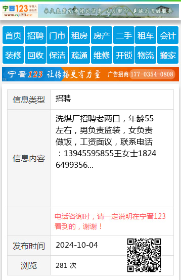 洗煤厂招聘老两口,年龄55左右,男负责监装,女负责做饭,工资面议,联系电话:13945595855王女士18246499356 【电话咨询时,请一定说明在七台河信息网看到的,谢谢!】 |