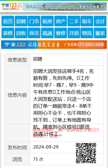招聘大润发驻店骑手4名,名额有限,先到先得。工作时间:早7-晚7,早9-晚9中午有休息工作地点:桃山区大润发配送站,只送一个店的订单一趟能带走4-8单不用担心不会干,也不用担心找不到,订单上有地图有导航。精准到小区楼号薪资待遇:计件工资,多劳多得,每单5.3元-7.8元根据距离。联系电话:15946422014李得文李15946422014 【电话咨询时,请一定说明在七台河信息网看到的,谢谢!】 |