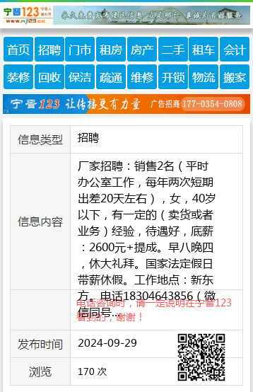 厂家招聘:销售2名(平时办公室工作,每年两次短期出差20天左右),女,40岁以下,有一定的(卖货或者业务)经验,待遇好,底薪:2600元+提成。早八晚四,休大礼拜。国家法定假日带薪休假。工作地点:新东方。电话18304643856(微信同号)孙先生18304643856 【电话咨询时,请一定说明在七台河信息网看到的,谢谢!】 |