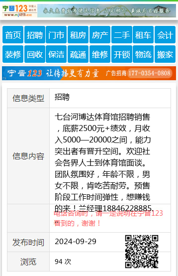 七台河博达体育馆招聘销售,底薪2500元+绩效,月收入5000—20000之间,能力突出者有晋升空间。欢迎社会各界人士到体育馆面谈。团队氛围好,年龄不限,男女不限,肯吃苦耐劳。预售阶段工作时间弹性,想赚钱的来!兰经理18846228885 【电话咨询时,请一定说明在七台河信息网看到的,谢谢!】 |