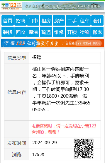 桃山区一驿站招店内客服一名:年龄45以下,手脚麻利,会操作手机即可,要求长期,工作时间早8点到17.30,工资1800+200满勤,满半年调薪一次谢先生13946505055 【电话咨询时,请一定说明在七台河信息网看到的,谢谢!】 |