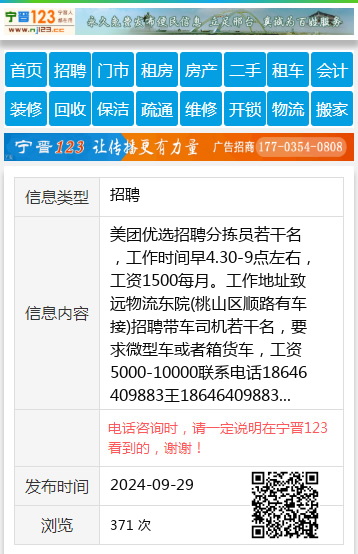 美团优选招聘分拣员若干名,工作时间早4.30-9点左右,工资1500每月。工作地址致远物流东院(桃山区顺路有车接)招聘带车司机若干名,要求微型车或者箱货车,工资5000-10000联系电话18646409883王18646409883 【电话咨询时,请一定说明在七台河信息网看到的,谢谢!】 |