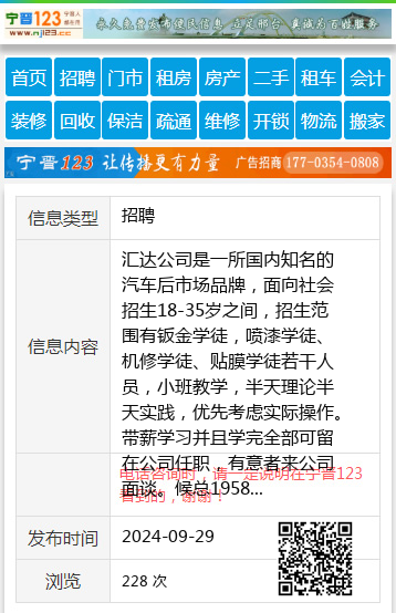 汇达公司是一所国内知名的汽车后市场品牌,面向社会招生18-35岁之间,招生范围有钣金学徒,喷漆学徒、机修学徒、贴膜学徒若干人员,小班教学,半天理论半天实践,优先考虑实际操作。带薪学习并且学完全部可留在公司任职,有意者来公司面谈。候总19586392666 【电话咨询时,请一定说明在七台河信息网看到的,谢谢!】 |