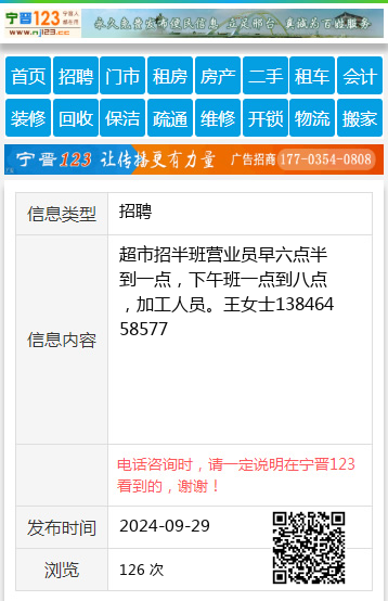 超市招半班营业员早六点半到一点,下午班一点到八点,加工人员。王女士13846458577