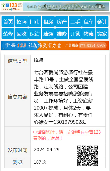 七台河爱尚旅游旅行社在景丰路13号,主做全国品质线路,定制线路,公司团建,业务发展需要招聘旅游接待员,工作环境好,工资底薪2000+提成,月休2天,要求人品好,有耐心,有责任心徐女士13019795028 【电话咨询时,请一定说明在七台河信息网看到的,谢谢!】 |
