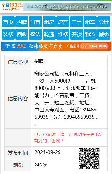 搬家公司招聘司机和工人,工资工人5000以上--司机8000元以上,要求跟车干活能出力,吃苦耐劳,工资十天一开,短工勿扰。地址,中国人寿对面。电话13946559935王先生13946559935 【电话咨询时,请一定说明在七台河信息网看到的,谢谢!】 |