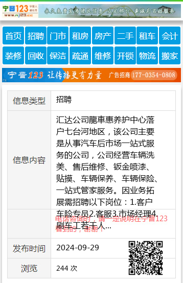 汇达公司龍車惠养护中心落户七台河地区,该公司主要是从事汽车后市场一站式服务的公司,公司经营车辆洗美、售后维修、钣金喷漆、贴摸、车辆保养、车辆保险、一站式管家服务。因业务拓展需招聘以下岗位:1.客户车险专员2.客服3.市场经理4.刷车工若干人员5.机修技师、学徒若干人6.喷漆技师、学徒若干人7.钣金技师、学徒若干人8.道路救援拖板车司机以上岗位薪资待遇优厚,每月带薪休息,定期团建。地址:27路终点站原北京现代4S店候总19586392666 【电话咨询时,请一定说明在七台河信息网看到的,谢谢!】 |