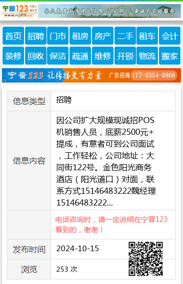 因公司扩大规模现诚招POS机销售人员,底薪2500元+提成,有意者可到公司面试,工作轻松,公司地址:大同街122号。金色阳光商务酒店(阳光道口)对面,联系方式15146483222魏经理15146483222