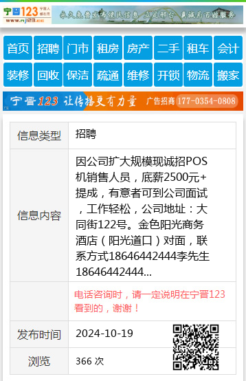 因公司扩大规模现诚招POS机销售人员,底薪2500元+提成,有意者可到公司面试,工作轻松,公司地址:大同街122号。金色阳光商务酒店(阳光道口)对面,联系方式18646442444李先生18646442444 【电话咨询时,请一定说明在七台河信息网看到的,谢谢!】 |