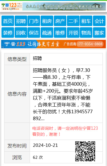 招聘服务员(女),早7.30——晚8.30,上午炸串,下午煮面,基础工资4000元,满勤+200元。要求年龄45岁以下,干活麻溜利索不偷懒,合得来工资年年涨,不能长干的勿扰!大伟13945577892