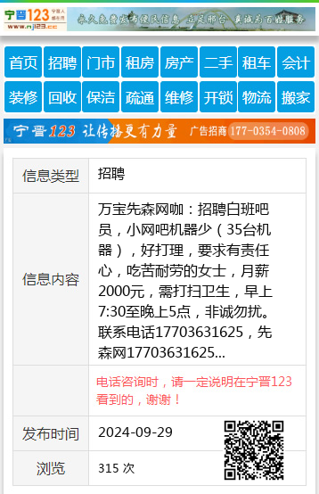万宝先森网咖:招聘白班吧员,小网吧机器少(35台机器),好打理,要求有责任心,吃苦耐劳的女士,月薪2000元,需打扫卫生,早上7:30至晚上5点,非诚勿扰。联系电话17703631625,先森网17703631625 【电话咨询时,请一定说明在七台河信息网看到的,谢谢!】 |