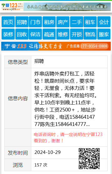 炸串店聘外卖打包工,活轻松!就是时间长点,要求年轻,无堂食,无体力活!要求干活利索。有无经验均可。早上10点半到晚上11点半,供吃!工资2500+,地址步行街中段,电话15846414777陈先生15846414777 【电话咨询时,请一定说明在七台河信息网看到的,谢谢!】 |