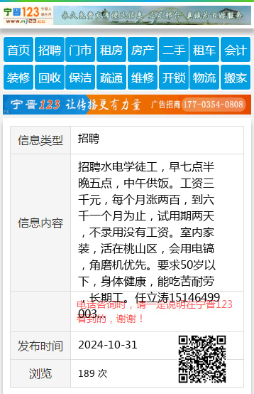 招聘水电学徒工,早七点半晚五点,中午供饭。工资三千元,每个月涨两百,到六千一个月为止,试用期两天,不录用没有工资。室内家装,活在桃山区,会用电镐,角磨机优先。要求50岁以下,身体健康,能吃苦耐劳,长期工。任立涛15146499003 【电话咨询时,请一定说明在七台河信息网看到的,谢谢!】 |