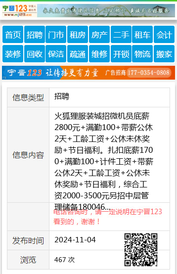 火狐狸服装城招微机员底薪2800元+满勤100+带薪公休2天+工龄工资+公休未休奖励+节日福利。扎扣底薪1700+满勤100+计件工资+带薪公休2天+工龄工资+公休未休奖励+节日福利,综合工资2000-3500元另招中层管理储备18004641455赵女士18004641455 【电话咨询时,请一定说明在七台河信息网看到的,谢谢!】 |