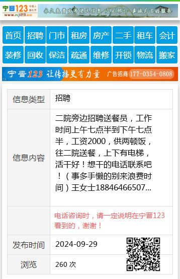二院旁边招聘送餐员,工作时间上午七点半到下午七点半,工资2000,供两顿饭,往二院送餐,上下有电梯,活干好!想干的电话联系吧!(事多手懒的别来浪费时间)王女士18846466507 【电话咨询时,请一定说明在七台河信息网看到的,谢谢!】 |