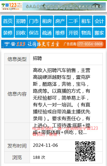 高收入招聘汽车销售,主营高端硬派越野车型,雷克萨斯,酷路泽,奔驰,宝马,路虎等。以直播的方式,有无经验都可,简单易上手,有专人一对一培训。(有直播经验或自带流量主播优先录用)。要求有责任心,有上进心。工资待遇:底薪+提成+带薪休假+供吃,轻松月入过万。联系电话:15804652123逄先生高女士13945580730 【电话咨询时,请一定说明在七台河信息网看到的,谢谢!】 |
