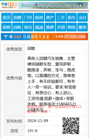 高收入招聘汽车销售,主营硬派越野车型,雷克萨斯,酷路泽,奔驰,宝马,路虎等。以直播的方式,简单易上手,有无经验都可,有专人一带一培训。要求:有驾驶证,有责任心,有上进心。工资待遇:底薪+提成+带薪休假。联系电话:15804652123逄先生高女士13945580730