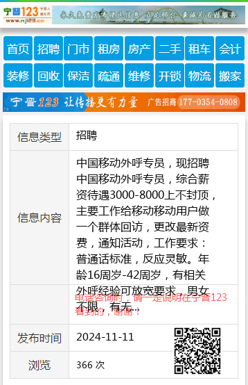 中国移动外呼专员,现招聘中国移动外呼专员,综合薪资待遇3000-8000上不封顶,主要工作给移动移动用户做一个群体回访,更改最新资费,通知活动,工作要求:普通话标准,反应灵敏。年龄16周岁-42周岁,有相关外呼经验可放宽要求,男女不限,有无经验均可。有带薪培训,综合工资3000以上,每月休息4-6天,有意电联杨女士13089531332 |