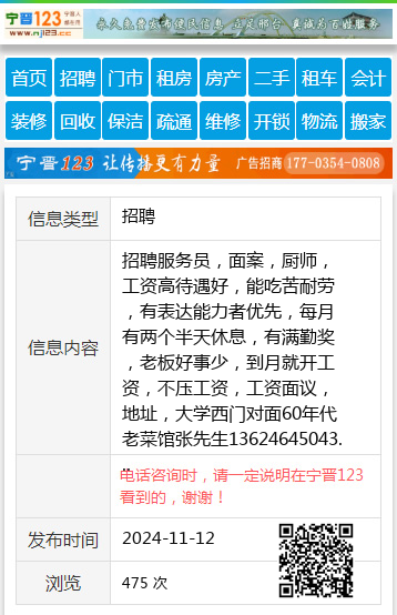 招聘服务员,面案,厨师,工资高待遇好,能吃苦耐劳,有表达能力者优先,每月有两个半天休息,有满勤奖,老板好事少,到月就开工资,不压工资,工资面议,地址,大学西门对面60年代老菜馆张先生13624645043 【电话咨询时,请一定说明在七台河信息网看到的,谢谢!】 |