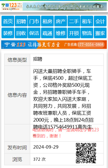 闪送大量招聘全职骑手,车手,保底4500,超过保底工资,公司格外奖励500元现金,另招聘兼职骑手车手,欢迎大家加入闪送大家庭,共同努力,共同发展,另招聘夜班兼职人员,保底工资2000元,晚上18点到24点招聘电话15754649911高先生15754649911 【电话咨询时,请一定说明在七台河信息网看到的,谢谢!】 |